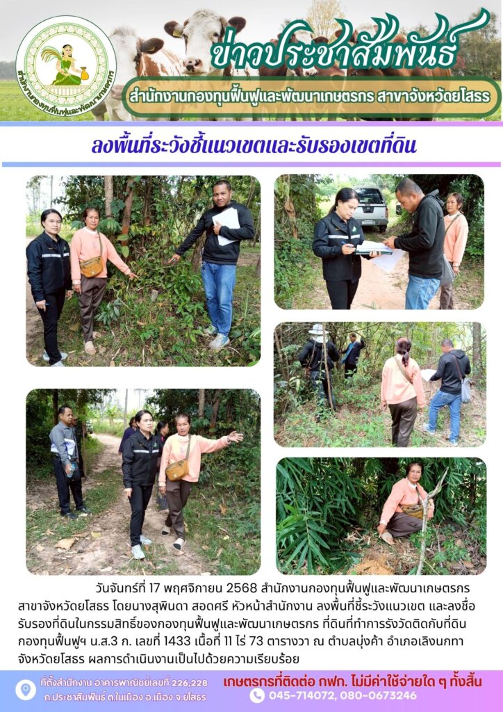 วันที่ 16 – 17 มิถุนายน 2568 สำนักงานกองทุนฟื้นฟูและพัฒนาเกษตรกร สาขาจังหวัดยโสธร โดยนางนุชฎา จำเริญสาร หัวหน้าสำนักงาน พร้อมคณะอนุกรรมการกองทุนฟื้นฟูและพัฒนาเกษตรกร ลงพื้นที่ตามโครงการสนับสนุนการดำเนินงานด้านการจัดการหนี้เกษตรกรของสำนักงานสาขาจังหวัด เพื่อติดตามเกษตรกรสมาชิกที่ได้รับการจัดการหนี้