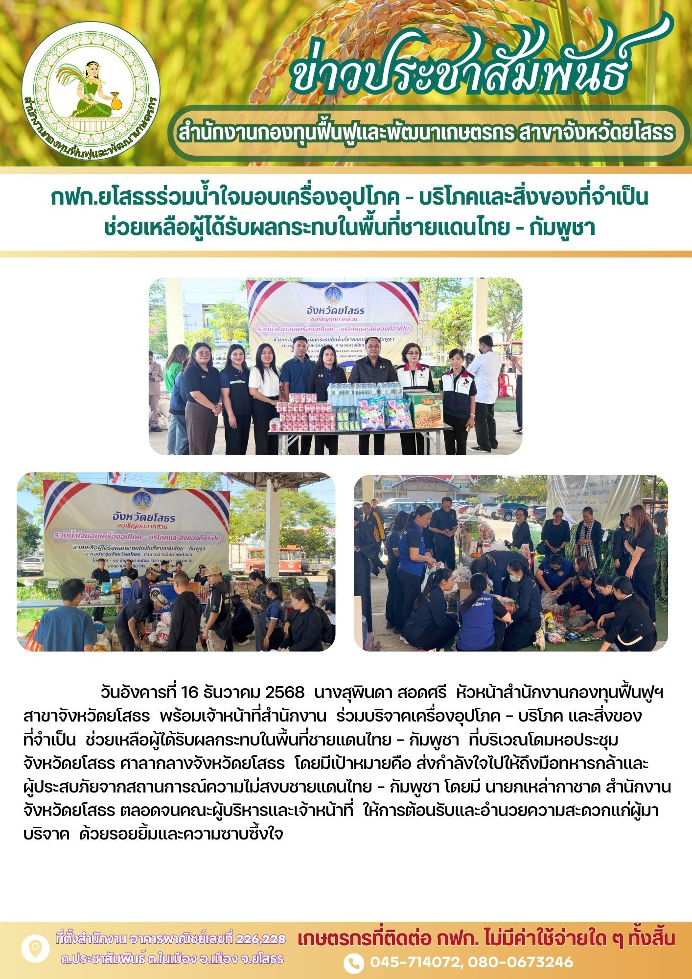- กฟก.ยโสธร รวมน้ำใจมอบเครื่องอุปโภค – บริโภคและสิ่งของที่จำเป็นช่วยเหลือผู้ได้รับผลกระทบในพื้นที่ชายแดนไทย – กัมพูชา