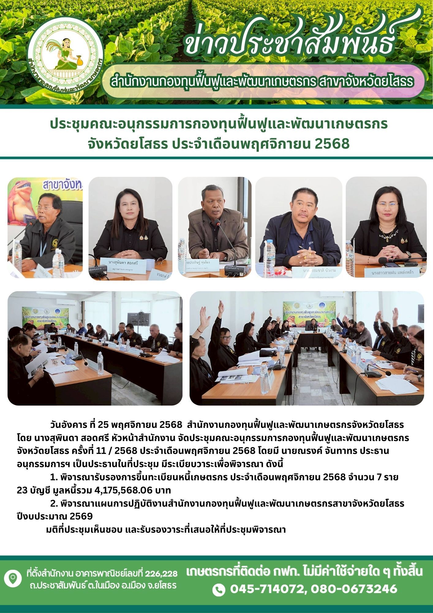 กองทุนฟื้นฟูฯยโสธร ประชุมคณะอนุกรรมการฯครั้งที่ 11/2568