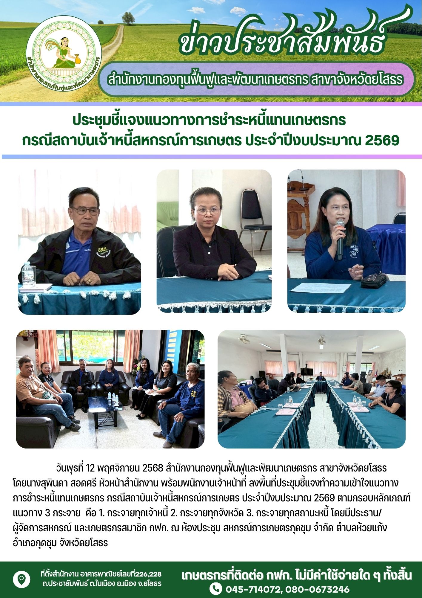 กฟก.ยโสธร ชี้แจงการชำระหนี้แทนเกษตรกร ประจำปึงบประมาณ 2569 กรณีสถาบันเจ้าหนี้สหกรณ์การเกษตร
