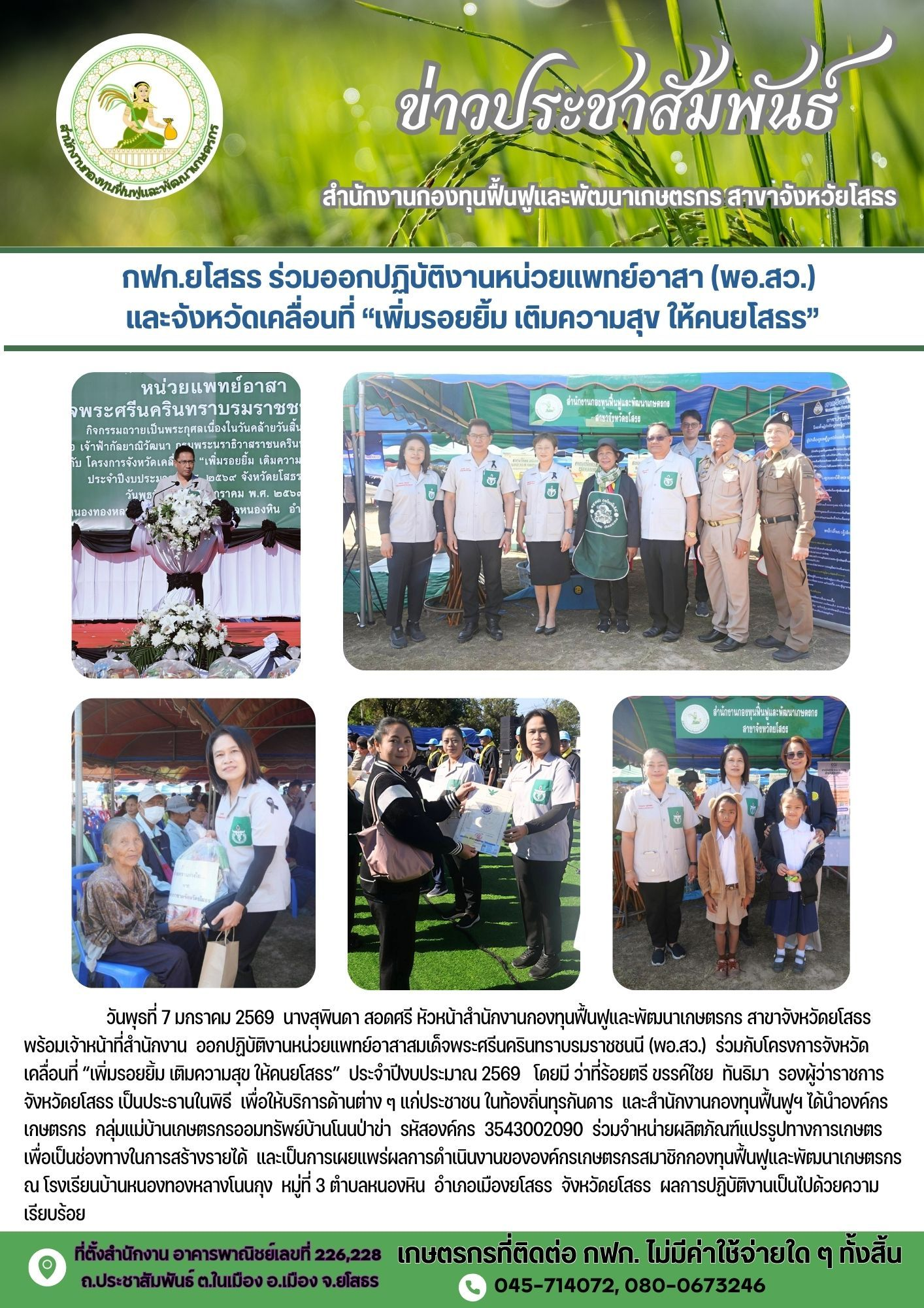 กฟก.ยโสธร ร่วมออกปฏิบัติงานหน่วยแพทย์อาสา (พอ.สว.)และจังหวัดเคลื่อนที่ “เพิ่มรอยยิ้ม เติมความสุข ให้คนยโสธร”