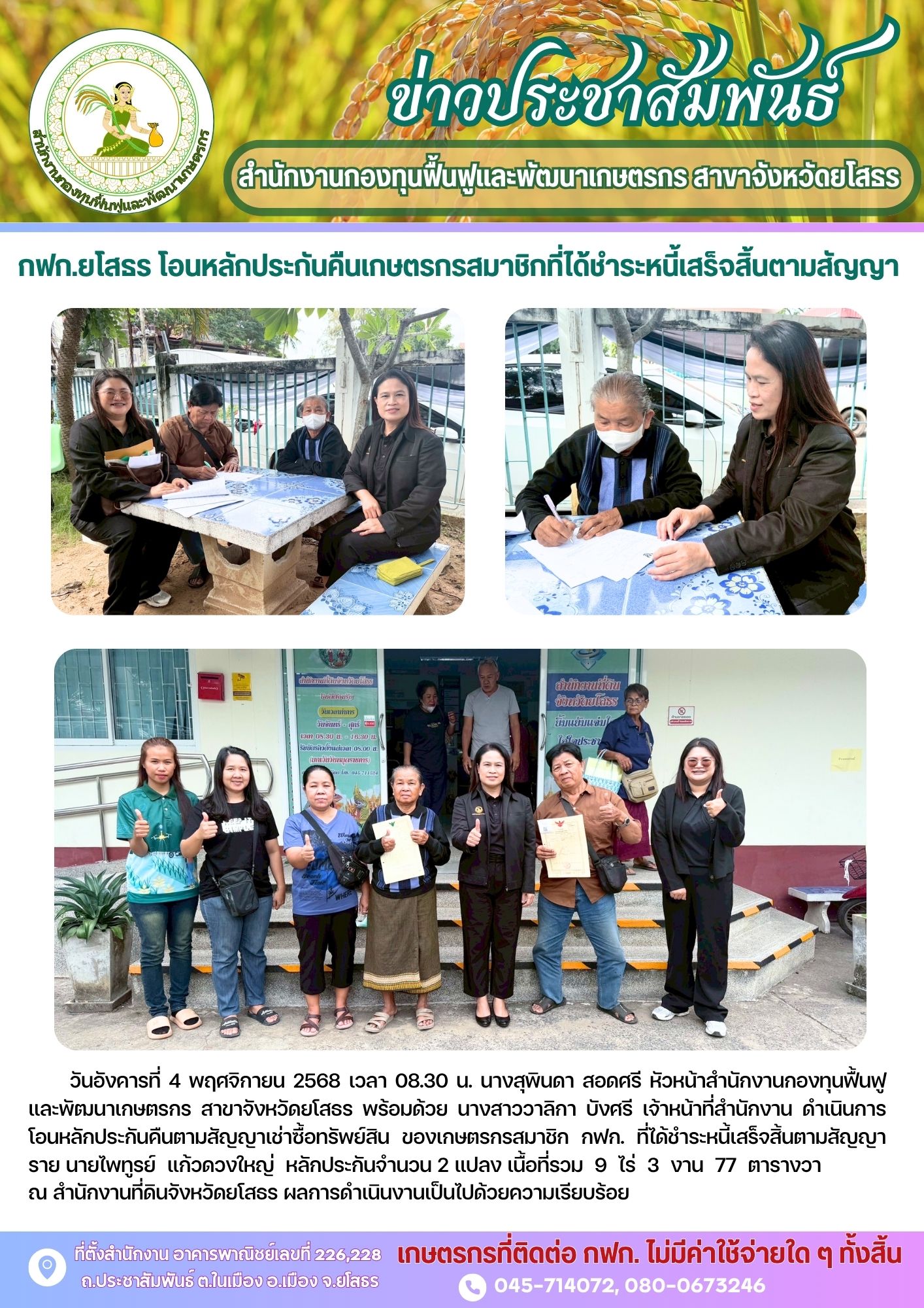 กฟก.ยโสธร มอบเช็คให้องค์กรเกษตรกรที่ได้รับอนุมัติโครงการฟื้นฟูอาชีพ และพัฒนาเกษตรกร ประเภทเป็นอุดหนุน ปิ๊งบประมาณ 2568
