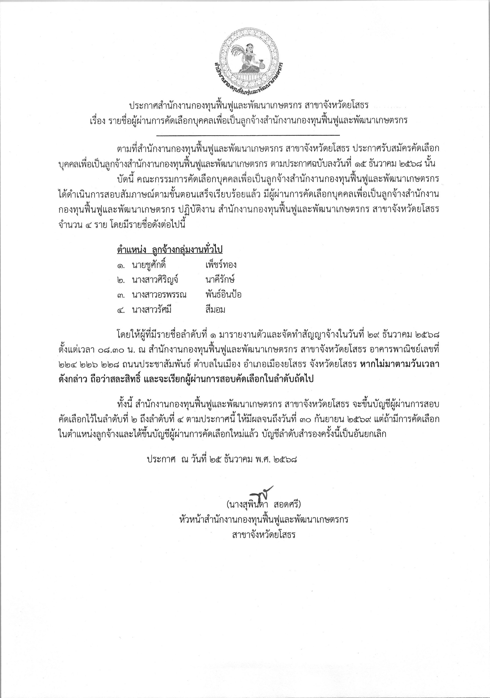 ประกาศรายชื่อผู้ผ่านการคัดเลือกเพื่อเป็นลูกจ้างสำนักงานกองทุนฟื้นฟูและพัฒนาเกษตรกร